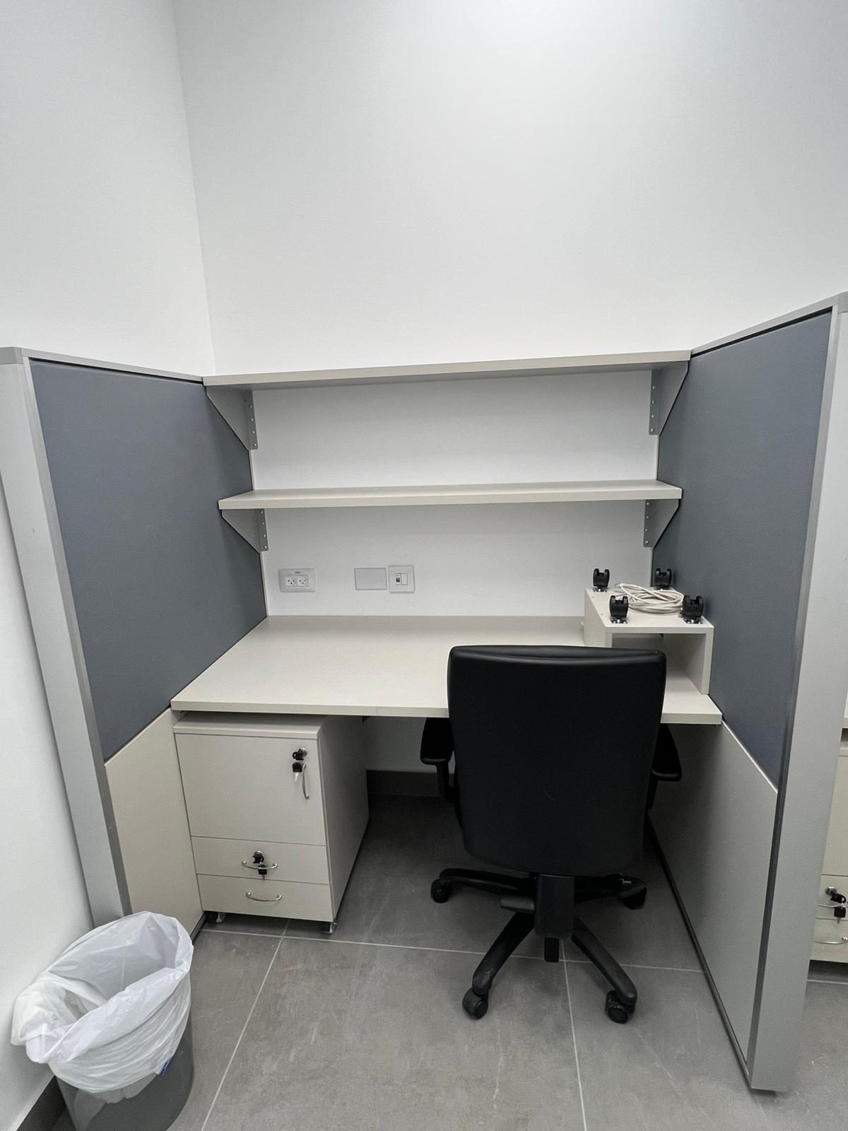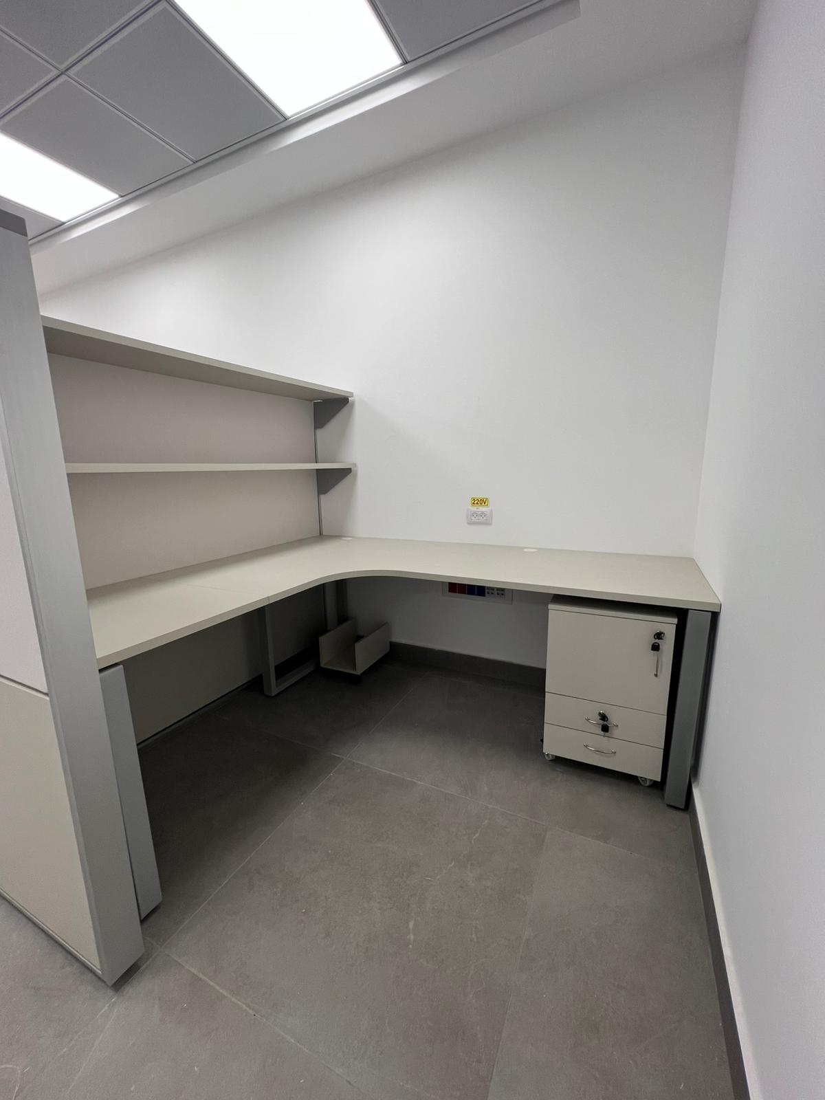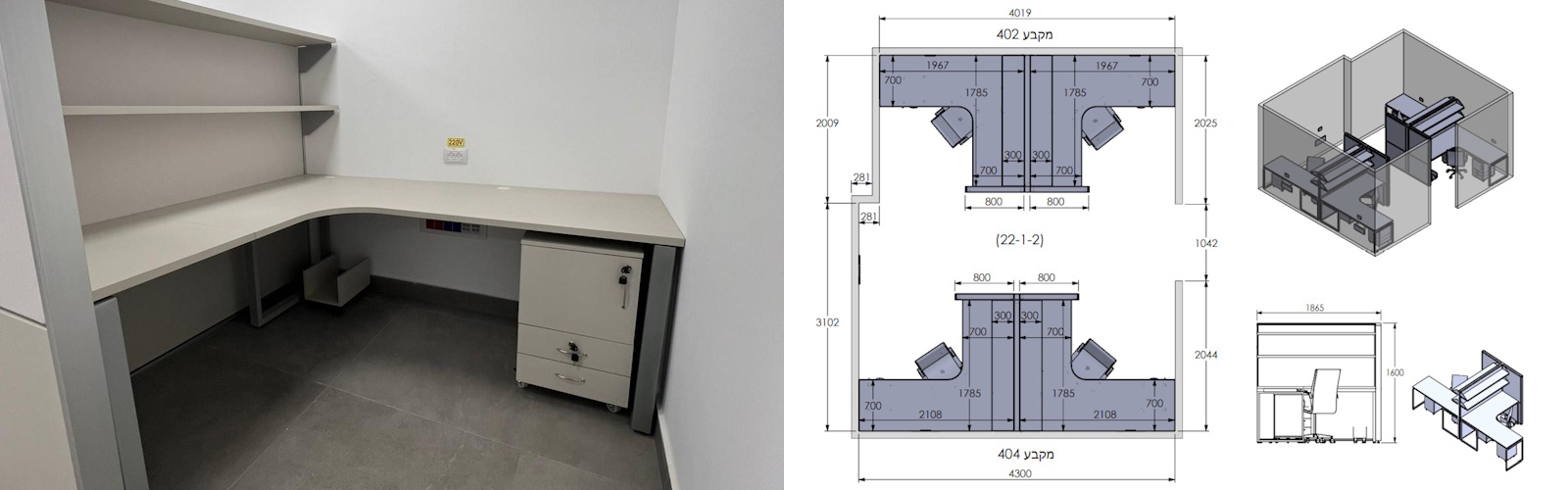 לצד המחיצות, שולבו בפרויקט משטחי עבודה צפים עשויים מלמין, מדפים לתלייה על המחיצה עם קונזולים בגוון כסוף, וארוניות אישיות ניידות תואמות. הארוניות כוללות דלת עליונה, שתי מגירות, מנגנוני נעילה בדלת ובמגירה העליונה עם מפתח מאסטר, וכן מעמד נייד ייעודי לכונן מחשב. שילוב כל הרכיבים יצר עמדות עבודה מסודרות, בטוחות ונוחות, המותאמות לצרכים התפעוליים של צוותי בית החולים ולסטנדרטים הגבוהים של מוסד רפואי מוביל.