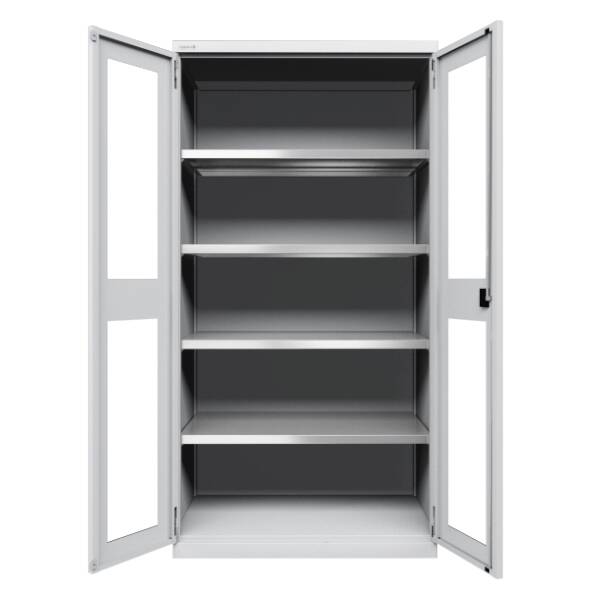 ארון אחסן מתכת עם דלתות פרספקס עשוי פלדה איכותית. דפנות ובסיסי הארון צבועים במוצרים בעלי עמידות גבוהה, ידידותיים לסביבה. הצדדים מחורצים במרווחים של 25 מ"מ כדי לאפשר התאמה של מגירות ומדפים בהתאם. דלתות מצוידות במנעול צילינדר בטיחות ו-2 מפתחות.