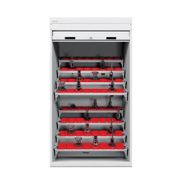 ארון כלי CNC עם תריס גלילה ו – 8 מדפים פנימיים – עשוי פלדה איכותית. שני לוחות הצד הפנימיים מחוררים כדי לאפשר התאמה מאובטחת של אביזרים כדי להתאים לדרישות המדויקות. מסגרת מתכת חזקה ופרופילי פלסטיק אופקיים עם אחיזת יד לתפעול קל מצויד במנעול צילינדר בטיחות ו-2 מפתחות.