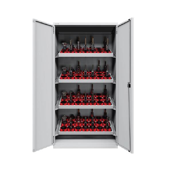 ארונית לכלים 4 מדפים – עשויה פלדה איכותית. זמינה עם דפנות מחורצות במרווחים של 25 מ"מ כדי לאפשר התאמה של מגירות, מדפים ומסגרות מחזיקי כלי עבודה בהתאם. הדלתות מצוידות במנעול צילינדר בטיחותי ו-2 מפתחות.