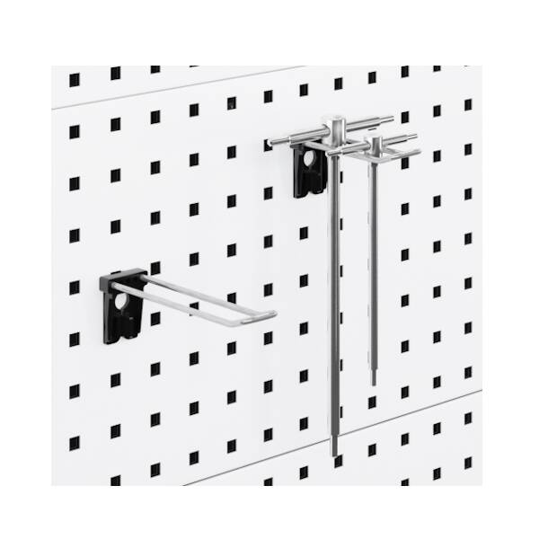 ווים לתלייה על לוחות מחוררים לשולחן עבודה ועמדות עבודה המבטיחים שכלים ואביזרים מאוחסנים בצורה מסודרת ותמיד יהיו בהישג יד על עגלות ועמדות עבודה נייחות וניידות. קוצים המשמשים כאביזרים בלוחות מחוררים לאחסון מלאי ובמערכות מדפים.