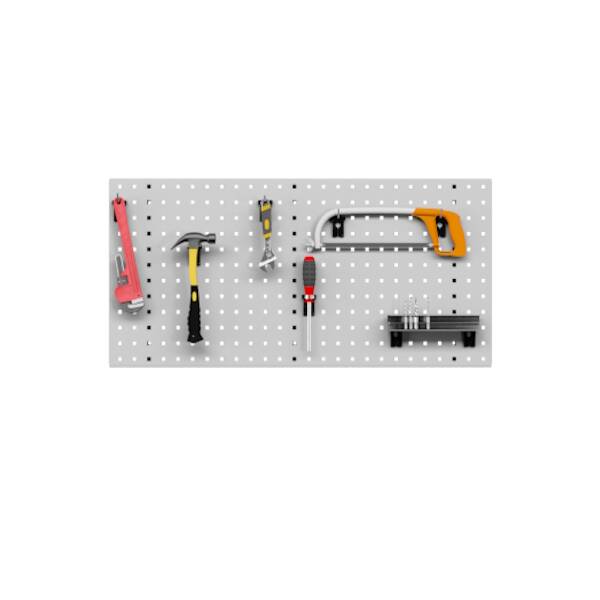 לוח אחורי מחורר לתליה על הקיר ברוחב של 100 ס"מ עם חורים מרובעים בגודל של 10×10 מ"מ ומרחק ממרכז למרכז של 38 מ"מ. פאנלים מחוררים מאפשרים להתקין מערכת של קרסים וקליפסים וליצור פריסה מאורגנת וחזותית לזיהוי מהיר, אחסון ושליפה של כלים.