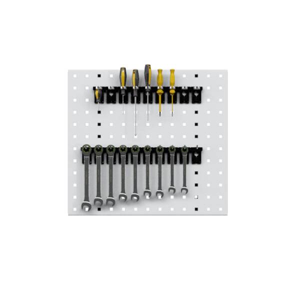 לוח אחורי מחורר לתליה על הקיר ברוחב של 50 ס"מ עם חורים מרובעים בגודל של 10×10 מ"מ ומרחק ממרכז למרכז של 38 מ"מ. פאנלים מחוררים מאפשרים להתקין מערכת של קרסים וקליפסים וליצור פריסה מאורגנת וחזותית לזיהוי מהיר, אחסון ושליפה של כלים.