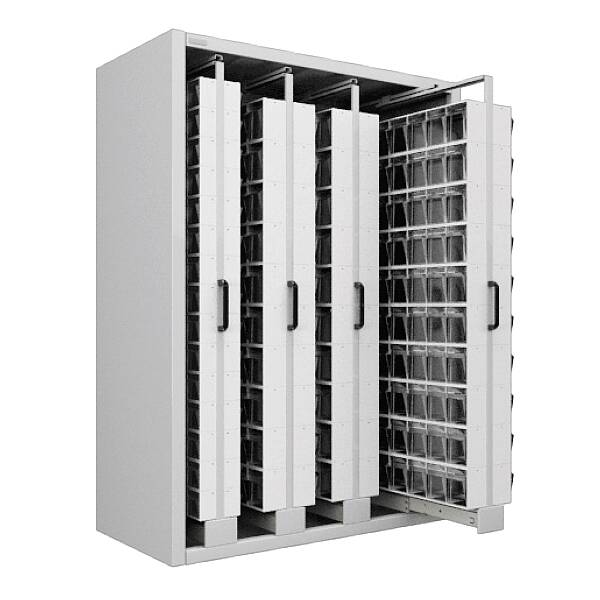 מערכת רב תא אנכית מודולרית UNIBOX בעלת 480 תאים – פתרון איכותי לאחסון רכיבים קטנים עם בקרת מלאי ויזואלית. ניתן להזמין מערכות אחסון בהתאמה אישית.