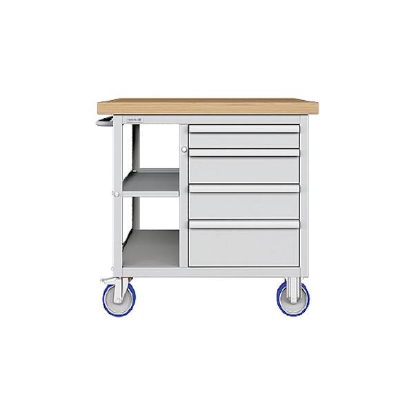 עגלת כלים ניידת עם 4 מגירות עשויה פלדה איכותית, עם דפנות מחורצות במרווחים של 25 מ"מ כדי לאפשר התאמה של מגירות ומדפים בהתאם. עמדת עבודה ניידת מצוידת במנעול צילינדר בטיחותי עם 2 מפתחות.