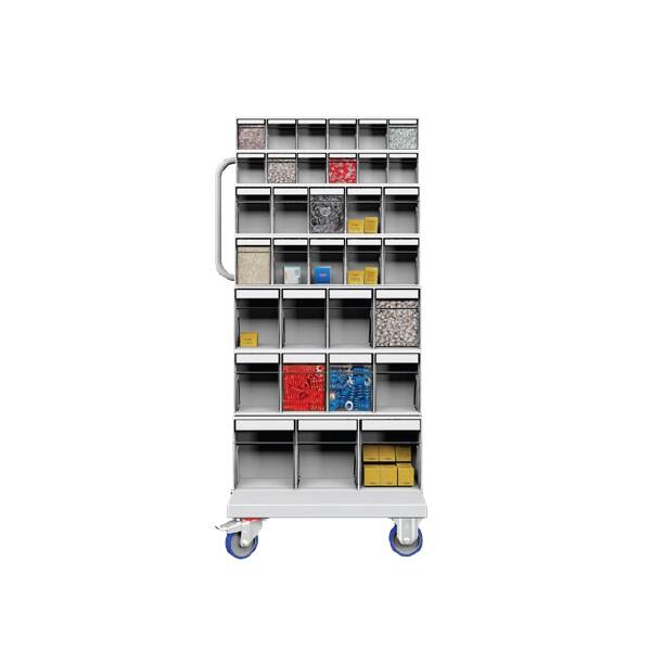 מערכת תאים מודולרית ניידת UNIBOX עם 66 תאים – פתרון איכותי לאחסון רכיבים קטנים עם בקרת מלאי ויזואלית. ניתן להזמין מערכות אחסון בהתאמה אישית.
