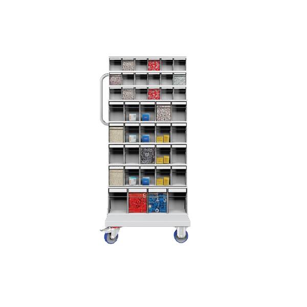 מערכת תאים מודולרית ניידת UNIBOX עם 84 תאים – פתרון איכותי לאחסון רכיבים קטנים עם בקרת מלאי ויזואלית. ניתן להזמין מערכות אחסון בהתאמה אישית.