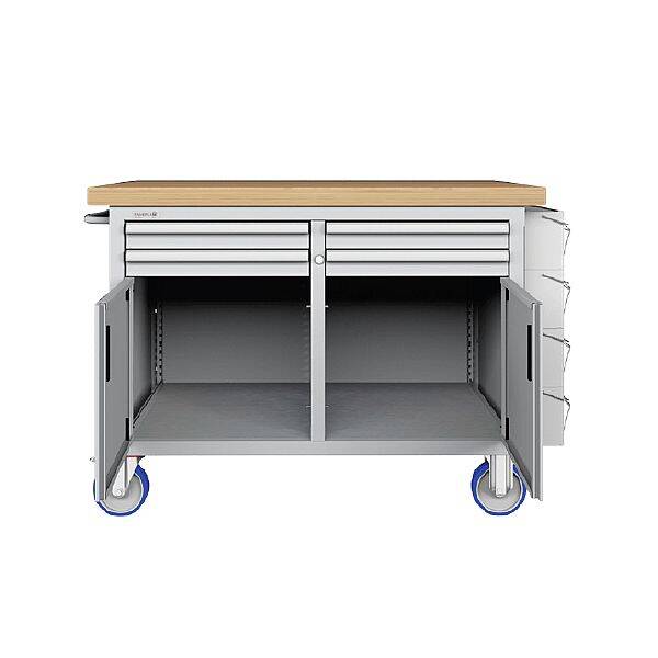 עמדת עבודה ניידת משולבת מגירות וארונות עשויה פלדה איכותית, עם דפנות מחורצות במרווחים של 25 מ"מ כדי לאפשר התאמה של מגירות ומדפים בהתאם. עמדת עבודה ניידת מצוידת במנעול צילינדר בטיחותי עם 2 מפתחות.