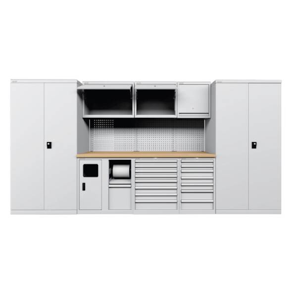 עמדת עבודה רחבה ומקצועית לסדנאות רכב המורכבת מ-2 ארונות עם דלתות צירים, ארון אקולוגי, 2 ארונות עם מגירות, משטח עבודה ומבנה המורכב מפנלים אחוריים ו-3 ארונות עיליים עם דלת נפתחת.