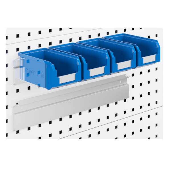 קופסאות פלסטיק עם מסילה ללוח מחורר לשולחן עבודה ועמדות עבודה המבטיחים שכלים ואביזרים מאוחסנים בצורה מסודרת ותמיד יהיו בהישג יד על עגלות ועמדות עבודה נייחות וניידות. קופסאות המשמשות כאביזרים בלוחות מחוררים לאחסון מלאי ובמערכות מדפים.