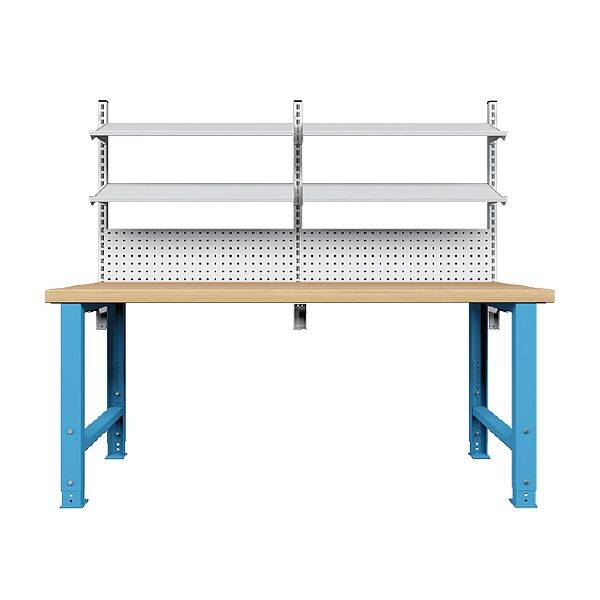 שולחן עבודה תעשייתי ברוחב של 200 ס"מ ופאנל אחורי מחורר איכותי לתלייה של כלים ואביזרים תעשייתיים. שולחן עבודה משולב מדפים מתכווננים ולוחות מחוררים.
