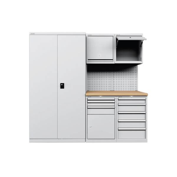 עמדת עבודה למוסכים וסדנאות רכב המורכבת מארון עם דלתות צירים, ארון עם 5 מגירות, ארון עם 3 מגירות ודלת, משטח עבודה ומבנה המורכב מפנלים אחוריים ו-2 ארונות עיליים עם פתח נפתח.