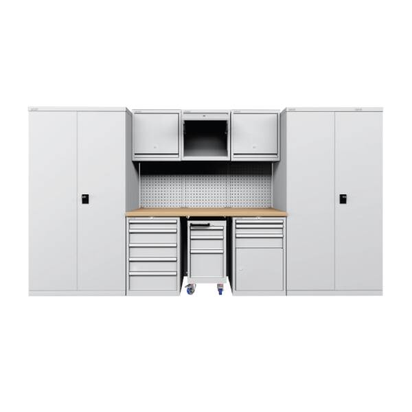 תחנת עבודה מקצועית מודולרית למוסכים המורכבת מ-2 ארונות עם דלתות צירים, 2 ארונות עם מגירות, עגלה עם 3 מגירות, משטח עבודה ומבנה המורכב מפנלים אחוריים ו-3 ארונות עיליים עם דלת נפתחת.