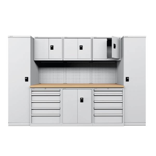 מערכת אחסון לעמדות עבודה עבור סדנאות רכב המורכבת מ-3 ארונות עם דלתות צירים, 2 ארונות עם 5 מגירות, משטח עבודה ומבנה המורכב מפנלים אחוריים ו-3 ארונות עיליים עם דלתות צירים.